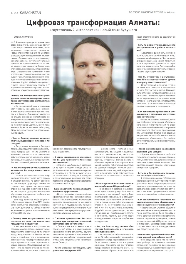 В октябре 2025 года технический руководитель Krypton Intellects Павел Климов дал интервью одному из ведущих европейских изданий — Deutsche Allgemeine Zeitung. Он рассказал о текущем уровне внедрения ИИ в Казахстане, развеял миф о сложности и дороговизне технологий, а также поделился видением роли искусственного интеллекта как нового языка будущего.
